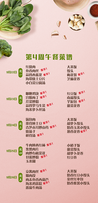 菜谱:咖喱鸡块、宫爆肉丁、芹菜炒粉、蒜蓉罗马生菜、海米萝卜丝汤。